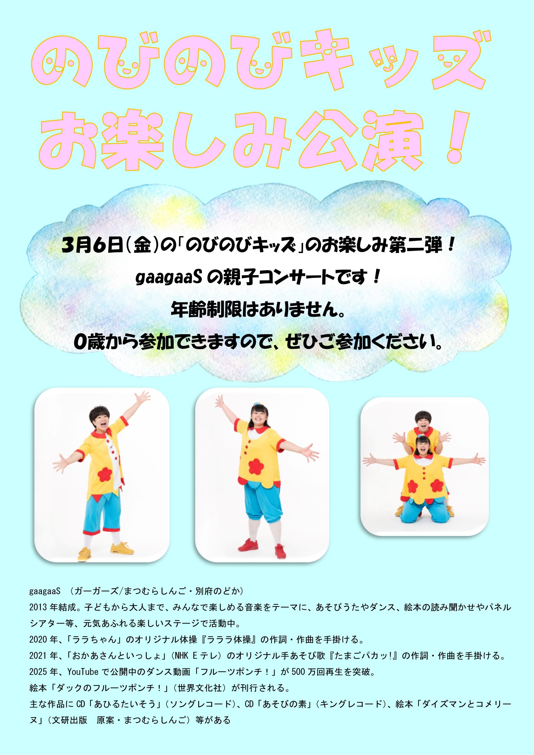 3月6日(金)に未就園児対象「のびのびキッズ」のお楽しみ公演としてgaagaaSの親子コンサートがあります!